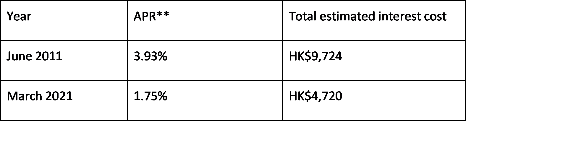 As illustrated in the table below, the Annualised Percentage Rate (“APR”)of a HKD500,000 loan instalment repayment in June 2011 was 3.93%*. The APR is 1.75% in March 2021, almost half of the 2011 level*.