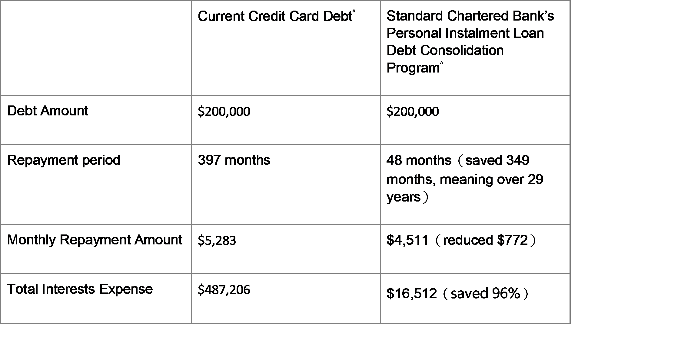 Below is an example of Standard Chartered Bank’s Personal Instalment Loan Debt Consolidation Program. Let us see what difference a balance transfer on a month repayment period can make with a credit card debt of HKD200,000: