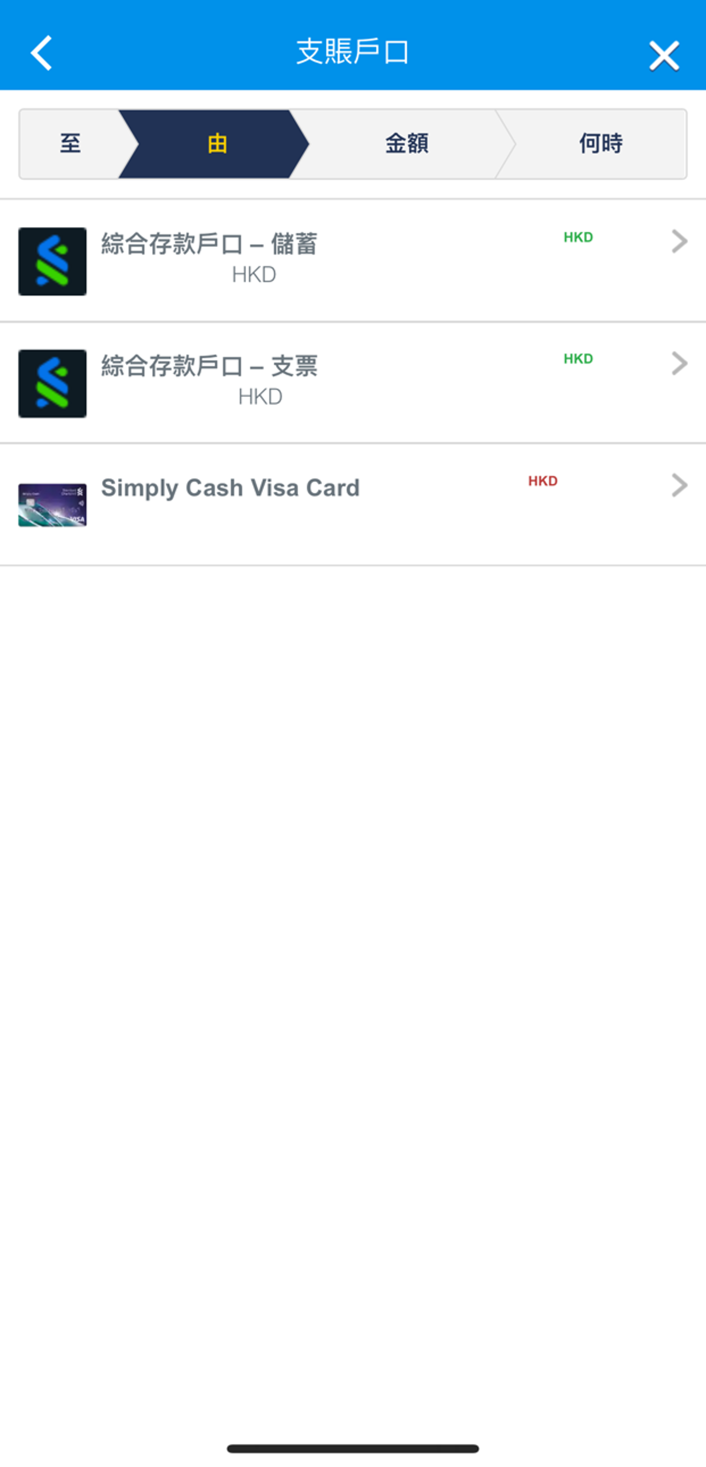 - 任何渣打VISA,萬事達卡 或 銀聯信用卡戶口 (港幣)
