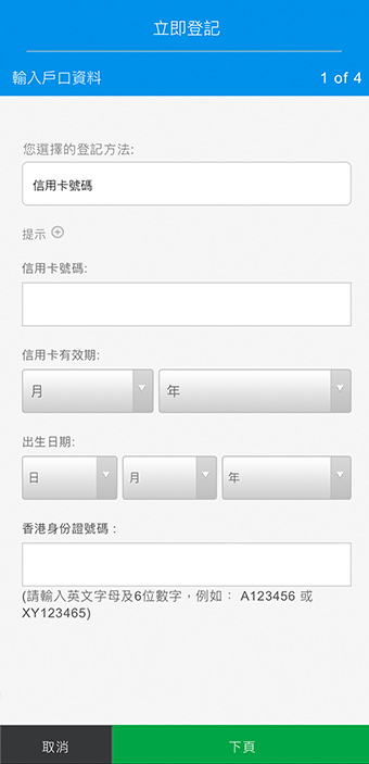 信用卡客戶 憑信用卡登記 輸入您的信用卡號碼、有效期限、出生日期及香港身份證號碼。