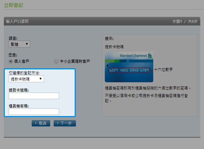 個人銀行客戶 憑提款卡登記 輸入您的提款卡號碼、有效期限及櫃員機密碼。