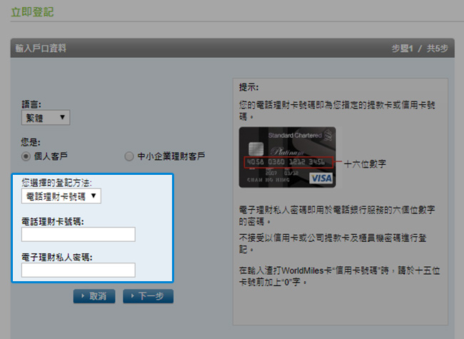 或 憑電話理財卡登記 輸入您的電話理財號碼及電子理財私人密碼。