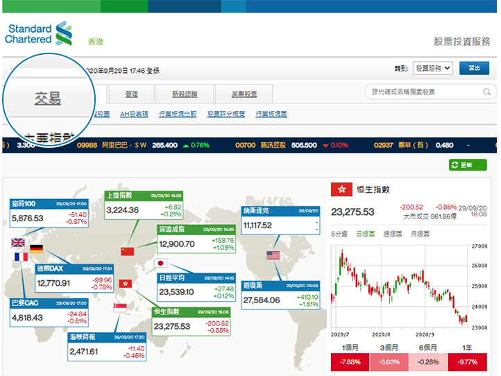 | 登入網上股票交易平台後從目錄點擊「交易」 |