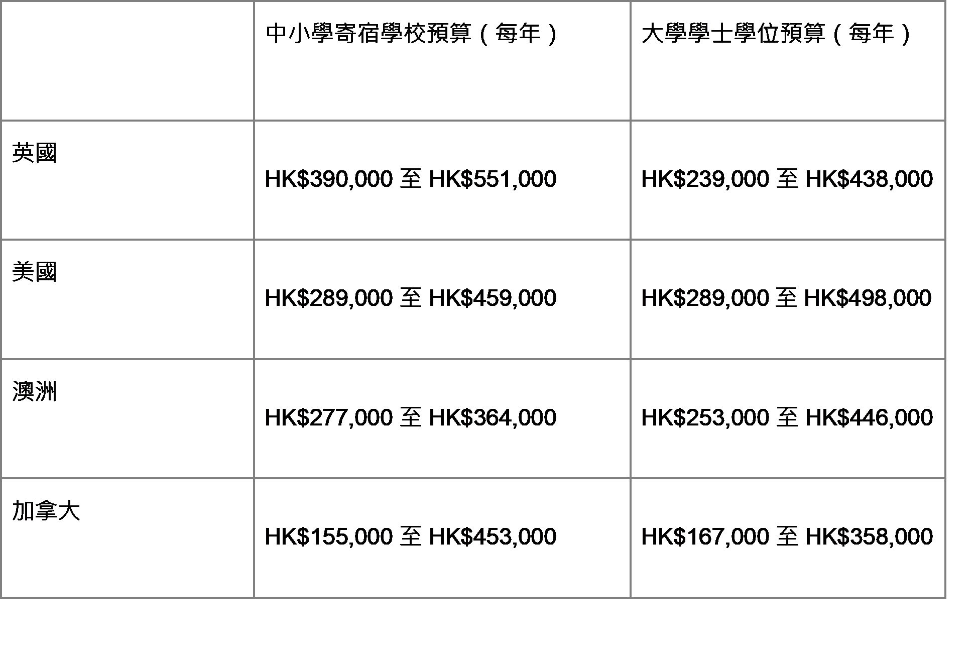 不少人愈來愈早送小朋友到外國讀書,由中小學Boarding School讀起也有。以下是到英國、美國、澳洲和加拿大讀中小學和大學分別的每年預算,你可以借此參考外國讀書計畫總共需要多少錢。但留意這只是學費和生活費(包含住宿、日常開支、保險)的大約預算,實際數字隨著學費調整、學科、通脹、匯率、生活質素要求等等因素而有差異。
