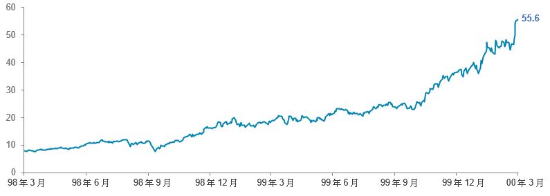 當然,有些公司的商業模式確實以強大的互聯網為中心,而且具備競爭優勢。思科系統(Cisco Systems)就是這樣的一家公司,它構建了互聯網的基礎網路。不出所料,由於市場炒作及定位的關係,思科的股價表現異常出色。在 2000 年 3 月的高峰時期,思科的股價幾乎是兩年前的七倍。